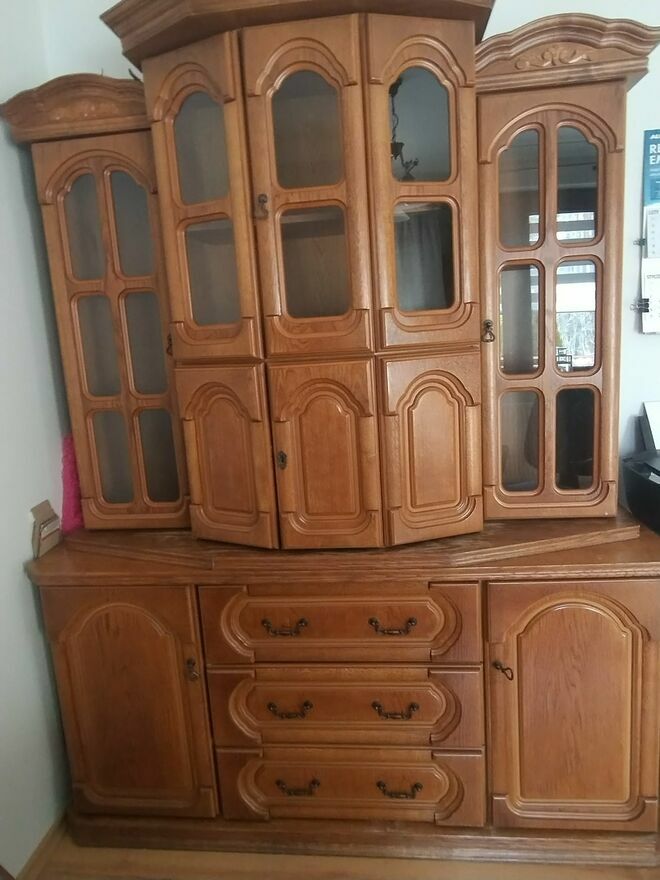 Do sprzedania mam duży kredens, komodę drewnianą z barkiem, szufladami oraz szafkami. Możliwy tylko odbiór osobisty.Wymiary: